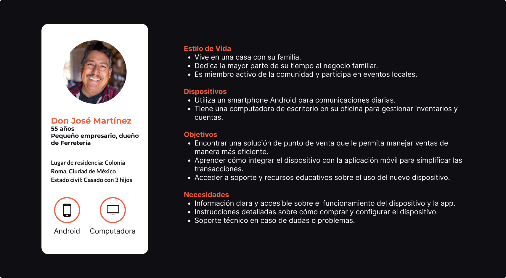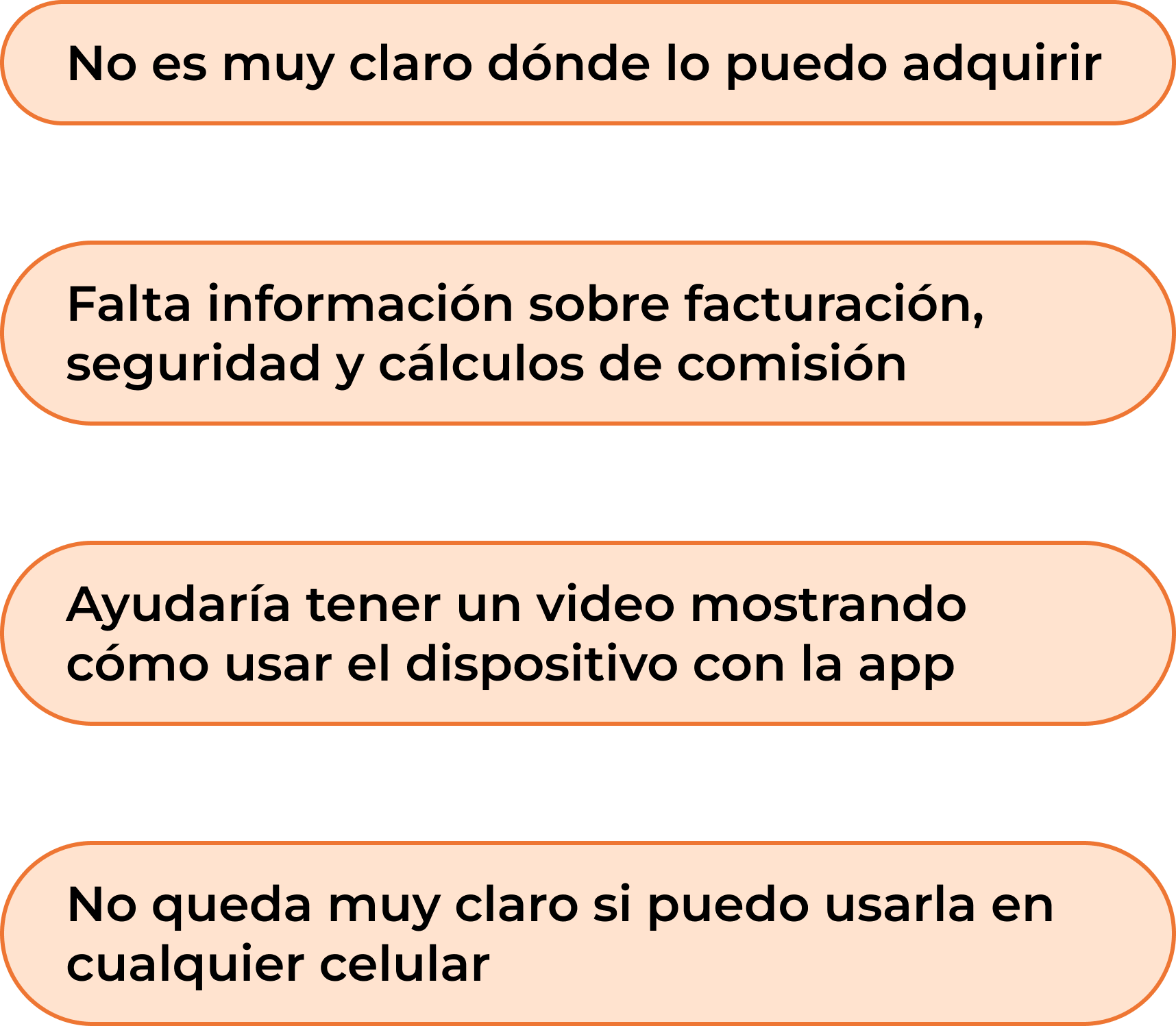 Estuvieron enfocadas en los flujos de consulta de información general del dispositivo de cobro, del uso de la aplicación y dónde adquirir el producto. Fueron pruebas realizadas con personas cercanas al equipo, que contaran con un negocio propio o que fueran trabajadores independientes.